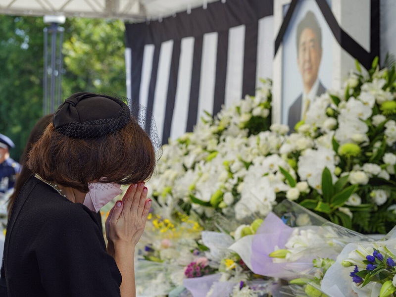 Μέσα στο Budokan, που είναι πιο γνωστό ως χώρος συναυλιών, ένα μεγάλο πορτρέτο του Άμπε με μαύρη κορδέλα δέσποζε πάνω από έναν πάγκο με πράσινα, άσπρα και κίτρινα λουλούδια.