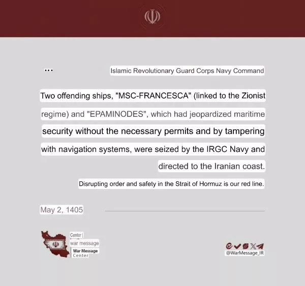 Η τοποθέτηση αυτή έρχεται μετά από ανακοίνωση που αποδίδεται στο ιρανικό «Κέντρο Πολεμικών Μηνυμάτων», σύμφωνα με την οποία τα πλοία MSC Francesca και Epaminondas κατασχέθηκαν από το Ναυτικό του Σώματος των Φρουρών της Ισλαμικής Επανάστασης (IRGC), με την κατηγορία ότι παραβίασαν κανόνες ναυσιπλοΐας και κινήθηκαν χωρίς τις απαιτούμενες άδειες, θέτοντας σε κίνδυνο την ασφάλεια της περιοχής.