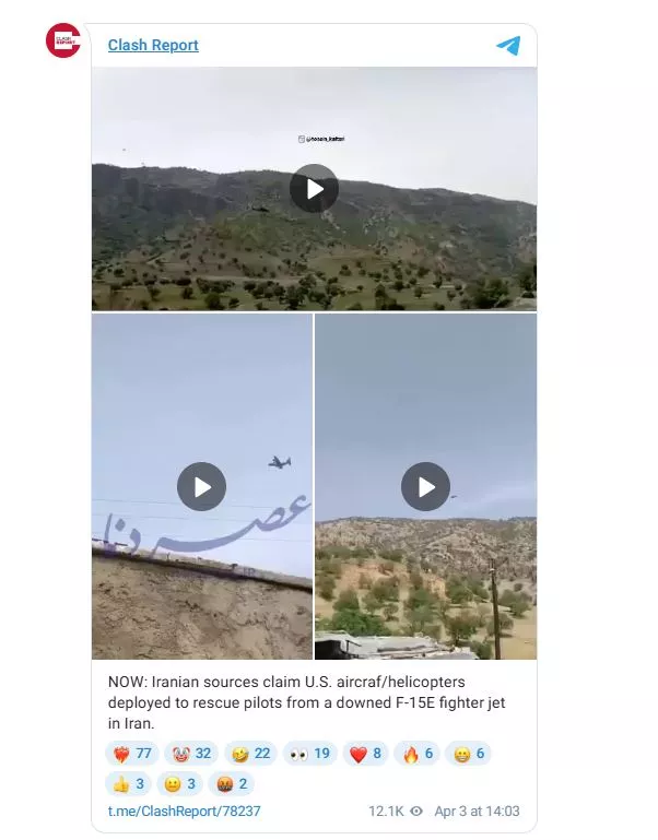 «Οι Αμερικανοί, πιστεύοντας ότι ο πιλότος τους ήταν ζωντανός, επιχειρούσαν να τον βγάλουν από τα ιρανικά σύνορα, αλλά ορισμένες πηγές λένε ότι ο πιλότος πιθανότατα συνελήφθη από τις ιρανικές δυνάμεις» αναφερόταν νωρίτερα, με βίντεο που φέρεται να δείχνουν επιχείρηση έρευνας διάσωσης να δημοσιεύονται στα κοινωνικά δίκτυα.