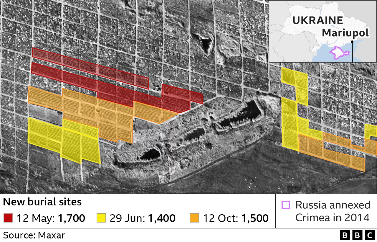 Πάνω από 1.500 νέοι τάφοι έχουν ανοιχτεί σ' ένα χώρο μαζικής ταφής κοντά στη Μαριούπολη της Ουκρανίας όπως αποκαλύπτει νέα ανάλυση δορυφορικών φωτογραφιών από το BBC.
