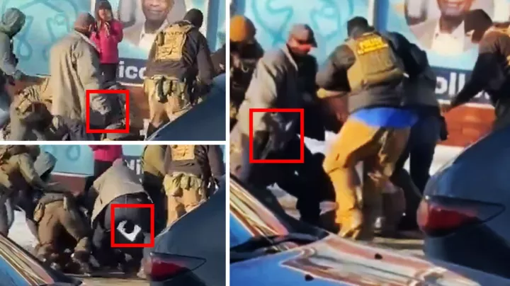 Στις εικόνες απεικονίζεται ο 37χρονος επιχειρεί να προστατεύσει γυναίκα που σπρώχνουν και πετούν στον δρόμο οι πράκτορες της ICE.