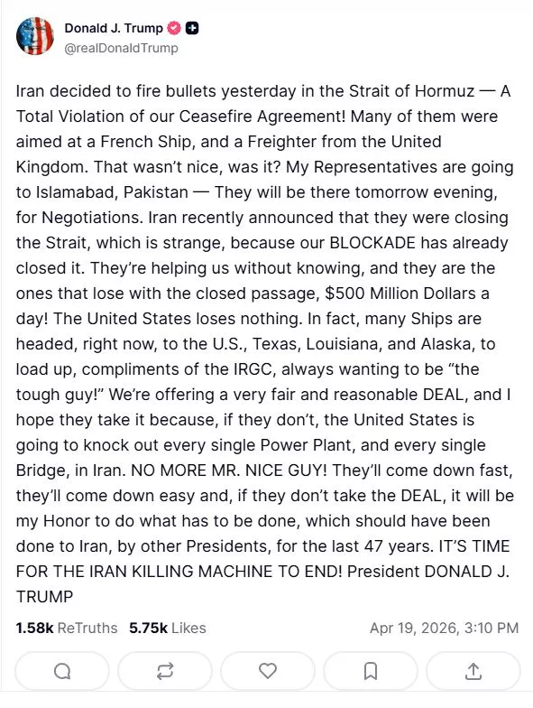 Οι εκπρόσωποί μου πηγαίνουν στο Ισλαμαμπάντ του Πακιστάν — θα βρίσκονται εκεί αύριο το βράδυ, για διαπραγματεύσεις. Το Ιράν ανακοίνωσε πρόσφατα ότι θα κλείσει το Στενό, κάτι που είναι παράξενο, επειδή ο ΑΠΟΚΛΕΙΣΜΟΣ μας το έχει ήδη κλείσει. Μας βοηθούν χωρίς να το γνωρίζουν, και είναι αυτοί που χάνουν από το κλειστό πέρασμα, 500 εκατομμύρια δολάρια την ημέρα! Οι Ηνωμένες Πολιτείες δεν χάνουν τίποτα.