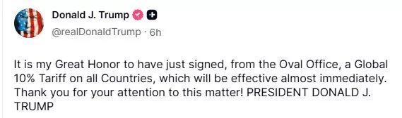 «Είναι μεγάλη μου τιμή που μόλις υπέγραψα στο Οβάλ Γραφείο έναν παγκόσμιο δασμό 10% σε όλες τις χώρες, που θα τεθεί σε ισχύ σχεδόν αμέσως», ανέφερε σε ανάρτησή του ο ένοικος του Λευκού Οίκου, προσθέτοντας ότι δεν χρειάζεται έγκριση από το Κογκρέσο για την εφαρμογή του μέτρου. Το πλήρες κείμενο της πράξης δεν δόθηκε άμεσα στη δημοσιότητα.