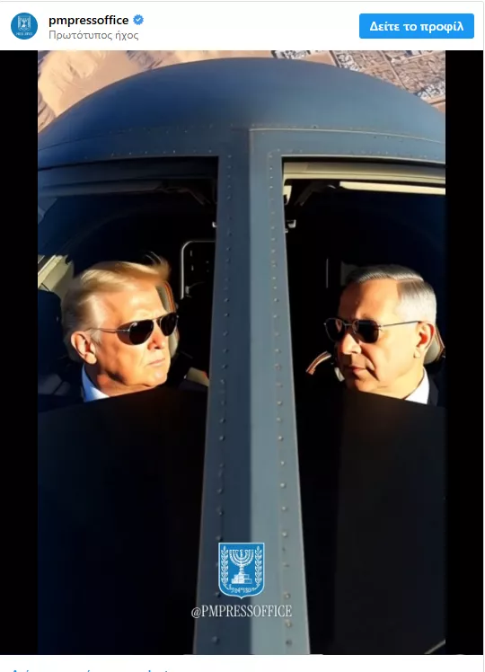 Ο Νετανιάχου εμφανίζεται στο πιλοτήριο ενός βομβαρδιστικού B-2, ίδιου τύπου με εκείνα που χρησιμοποιήθηκαν στην επίθεση κατά των ιρανικών πυρηνικών υποδομών, έχοντας στο πλευρό του τον πρώην πρόεδρο των ΗΠΑ.