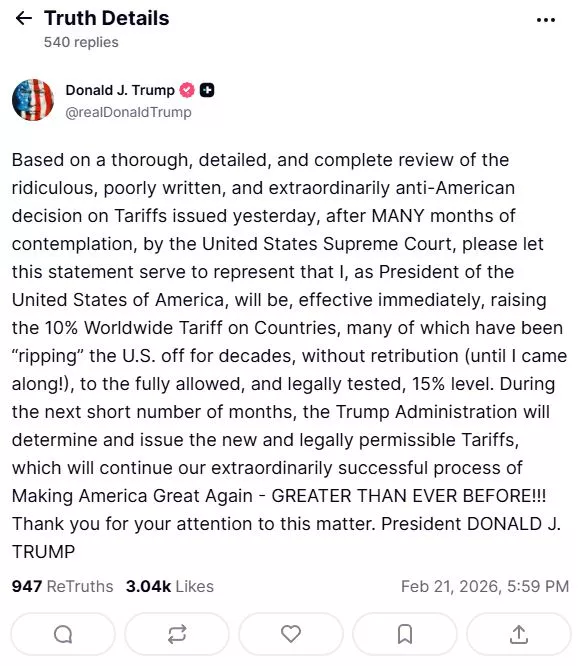 Ο Ντόναλντ Τραμπ, ανακοίνωσε την απόφασή του να αυξήσει από 10% σε 15% τον δασμό που είχε επιβάλει προηγουμένως σε εισαγωγές από όλο τον κόσμο.