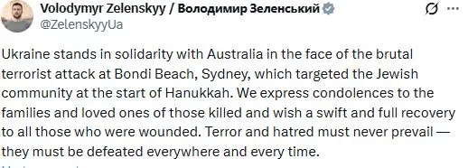 Ο Ουκρανός πρόεδρος Βολοντίμιρ Ζελένσκι εξέφρασε την «αλληλεγγύη» της χώρας του «ενώπιον της βάναυσης τρομοκρατικής επίθεσης (...) που στόχευσε την εβραϊκή κοινότητα στην αρχή του Χάνουκα».