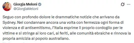 «Καταδικάζοντας για ακόμη μια φορά σθεναρά κάθε μορφή βίας και αντισημιτισμού, η Ιταλία εκφράζει τα συλλυπητήριά της για τα θύματα και παραμένει στο πλευρό των αγαπημένων τους προσώπων, των τραυματιών, της εβραϊκής κοινότητας και ανανεώνει τη φιλία της με τον αυστραλιανό λαό», έγραψε η Ιταλίδα πρωθυπουργός Τζόρτζια Μελόνι στο X, εκφράζοντας τη «βαθιά της θλίψη».