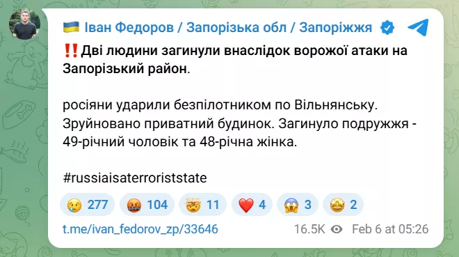 «Ιδιωτική κατοικία καταστράφηκε. Ζευγάρι είναι νεκρό, άνδρας 49 ετών και γυναίκα 48 ετών», ανέφερε μέσω Telegram ο επικεφαλής της στρατιωτικής διοίκησης, Ιβάν Φεντόροφ.