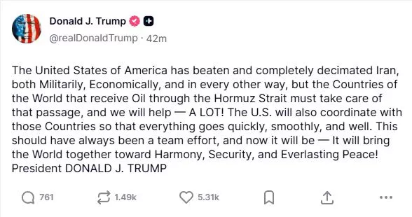 «Οι Ηνωμένες Πολιτείες της Αμερικής έχουν νικήσει και έχουν αποδεκατίσει πλήρως το Ιράν, τόσο στρατιωτικά όσο και οικονομικά, αλλά οι χώρες του κόσμου που εφοδιάζονται με πετρέλαιο μέσω του Στενού του Ορμούζ πρέπει να φροντίσουν για την ασφάλεια αυτού του περάσματος, και εμείς θα βοηθήσουμε — πάρα πολύ! Οι ΗΠΑ θα συντονιστούν επίσης με αυτές τις χώρες, ώστε όλα να προχωρήσουν γρήγορα, ομαλά και καλά. Αυτό θα έπρεπε να ήταν πάντα μια ομαδική προσπάθεια, και τώρα θα είναι — Θα φέρει τον κόσμο κοντά στην αρμονία, την ασφάλεια και την αιώνια ειρήνη!» αναφέρει σε νέο μήνυμά του μέσω της πλατφόρμας Truth Social ο πρόεδρος των ΗΠΑ.