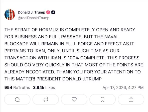 Aν και τα Στενά του Ορμούζ είναι πλέον ανοιχτά, ο ναυτικός αποκλεισμός κατά του Ιράν παραμένει σε ισχύ έως την ολοκλήρωση της συμφωνίας με τις ΗΠΑ, δήλωσε ο Ντόναλντ Τραμπ.