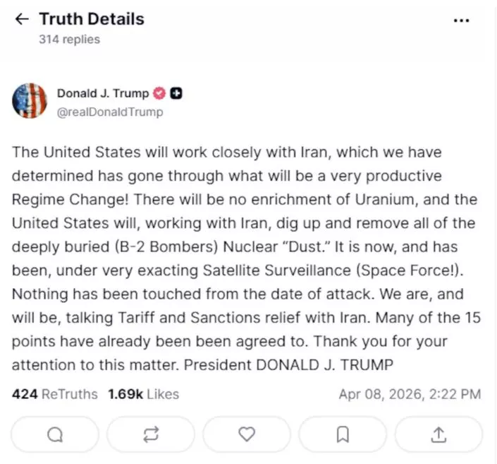 Ο Ντόναλντ Τραμπ απέρριψε ένα από τα βασικά σημεία του Ιράν για τη συμφωνία κατάπαυσης του πυρός. Σε ανάρτησή του στο Truth Social, ο Τραμπ δηλώνει ότι οι ΗΠΑ θα «συνεργαστούν στενά» με το Ιράν, αλλά «δεν θα γίνει εμπλουτισμός ουρανίου».