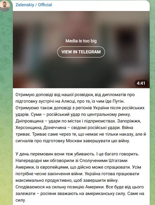 «Λαμβάνω αναφορές από τις μυστικές μας υπηρεσίες και από διπλωμάτες σχετικά με την προετοιμασία της συνάντησης στην Αλάσκα, για το τι σχεδιάζει ο Πούτιν. Λαμβάνουμε επίσης αναφορές από τις περιοχές της Ουκρανίας μετά τα ρωσικά χτυπήματα: