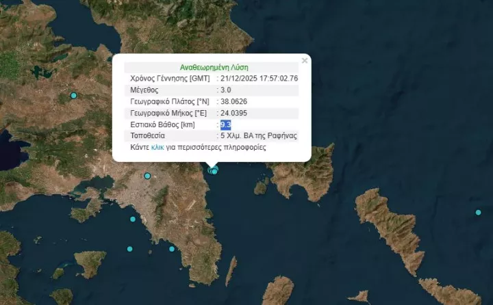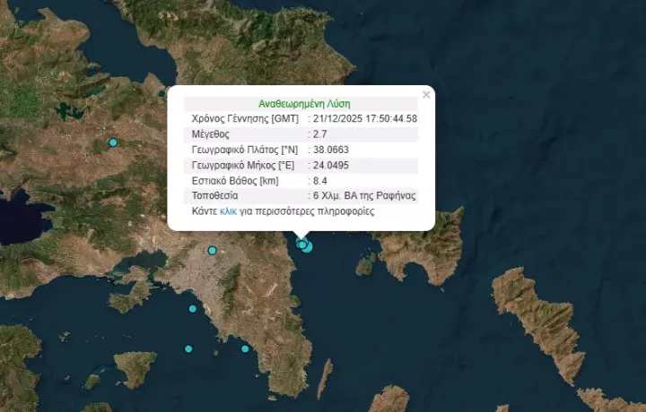 Δύο σεισμικές δονήσεις 3 Ρίχτερ και 2,7 Ρίχτερ σημειώθηκαν βορειοανατολικά της Ραφήνας το βράδυ της Κυριακής