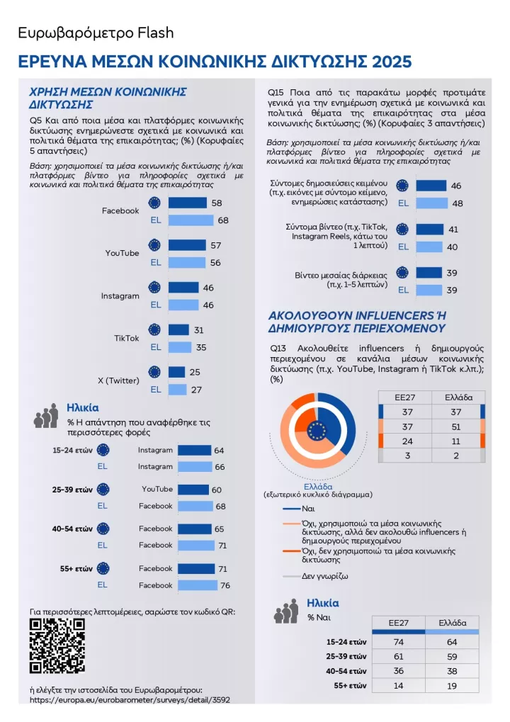 Τα αποτελέσματα της έρευνας flash Ευρωβαρόμετρο «Social Media 2025», που διεξήχθη τον Ιούνιο του 2025, δημοσίευσε το Ευρωπαϊκό Κοινοβούλιο.