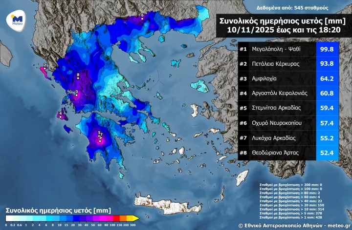 Όπως αποτυπώνεται σε χάρτη του Εθνικού Αστεροσκοπείου Αθηνών/ meteo.gr το μεγαλύτερο ύψος βροχής μέχρι και τις 18:20 ώρα Ελλάδας καταγράφεται στο Ψαθί Μεγαλόπολης με 99,8 mm, ενώ ακολουθεί η Πετάλεια Κέρκυρας με 93,8 mm.