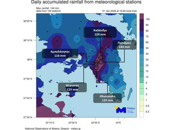 Σύμφωνα με το δίκτυο αυτόματων μετεωρολογικών σταθμών του Εθνικού Αστεροσκοπείου Αθηνών / Meteo τα μεγαλύτερα ύψη βροχής μέχρι τις 20:00 καταγράφηκαν στην περιοχή Παπάγου Αττικής με 146.4mm, ακολουθεί η Τακτικούπολη Τριζοινίας με 130.4mm και ο Βύρωνας Αττικής με 126.4mm όπως αποτυπώνεται στο Χάρτη 1.