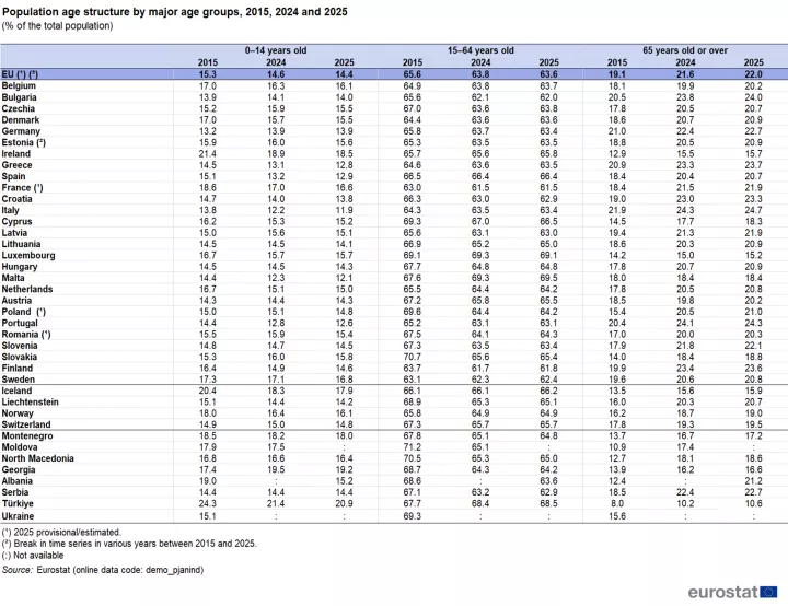 Ο πληθυσμός της ΕΕ την 1η Ιανουαρίου 2025 εκτιμήθηκε σε 450,6 εκατομμύρια άτομα. Τα παιδιά ηλικίας 0 έως 14 ετών αποτελούσαν το 14,4 % του πληθυσμού της ΕΕ (πίνακας 1), ενώ τα άτομα που θεωρούνται σε ηλικία εργασίας (15 έως 64 ετών) αντιπροσώπευαν το 63,6 % του πληθυσμού. Οι ηλικιωμένοι (ηλικίας 65 ετών και άνω) αντιπροσώπευαν το 22,0 % (αύξηση 0,4 ποσοστιαίων μονάδων (π.μ.) σε σύγκριση με το προηγούμενο έτος και αύξηση 2,9 π.μ. σε σύγκριση με 10 χρόνια νωρίτερα). Συγκριτικά, το 2024 οι τρεις ομάδες πληθυσμού, τα παιδιά (ηλικίας 0 έως 14 ετών), οι ενήλικες σε ηλικία εργασίας (ηλικίας 15 έως 64 ετών) και οι ηλικιωμένοι (ηλικίας 65 ετών και άνω) αντιπροσώπευαν, αντίστοιχα, το 14,6 %, το 63,8 % και το 21,6 % του πληθυσμού της ΕΕ.