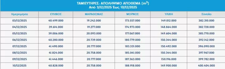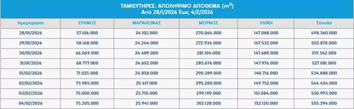 Χαρακτηριστικά είναι στα στοιχεία της ΕΥΔΑΠ που ανανεώνονται σχεδόν καθημερινά στην ιστοσελίδα της. Σημειώνεται, ότι ενώ στις 3 Δεκεμβρίου του 2024, το απολήψιμο απόθεμα στους ταμιευτήρες ήταν 382.310.000 κυβικά μέτρα, δύο μήνες μετά, στις 4 Φεβρουαρίου του 2026, το απόθεμα ανέρχεται στα 555.394.000 κυβικά μέτρα. Άρα, σε αυτό το διάστημα, παρατηρείται μια αύξηση 173.084.000 κυβικών μέτρων.