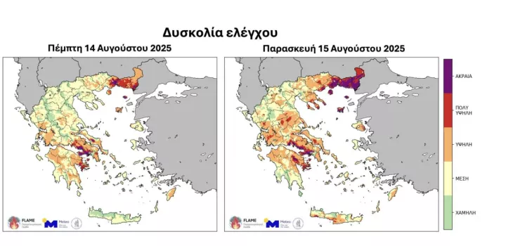Συγκεκριμένα, σύμφωνα με ανάρτηση της Πυρομετεωρολογικής Ομάδας FLAME του Meteo, ο κίνδυνος εκδήλωσης πυρκαγιάς αναμένεται ιδιαίτερα υψηλος σε Ανατολική Μακεδονία και Θράκη την Πέμπτη και την Παρασκευή, ενώ δυσμενείς πυρομετεωρολογικές συνθήκες προβλέπονται και για την Κυριακή 17 Αυγούστου.