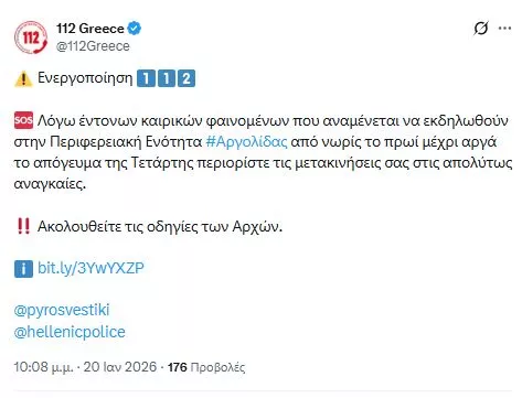 «Λόγω έντονων καιρικών φαινομένων που αναμένεται να εκδηλωθούν στην Περιφερειακή Ενότητα Αργολίδας από νωρίς το πρωί μέχρι αργά το απόγευμα της Τετάρτης περιορίστε τις μετακινήσεις σας στις απολύτως αναγκαίες. κολουθείτε τις οδηγίες των Αρχών», αναφέρει το έταιρο μήνυμα του 112.