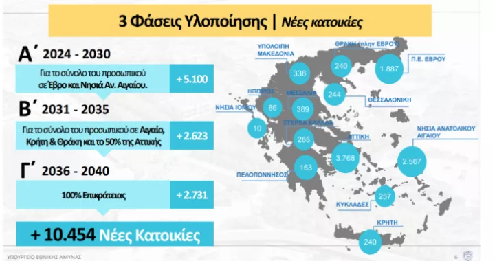 Το πλήρες οικιστικό πρόγραμμα των Ενόπλων Δυνάμεων παρουσίασε ο υπουργός Εθνικής Άμυνας Νίκος Δένδιας. Μέχρι το 2040 οι κατοικίες θα ανέρχονται σε 17.487, ενώ ήδη η πρώτη φάση του προγράμματος περιλαμβάνει 702 διαμερίσματα σε 54 συγκροτήματα, αρχικά σε 5 πόλεις της Θράκης και 13 νησιά του Αιγαίου, προϋπολογισμού 100 εκατομμυρίων ευρώ.