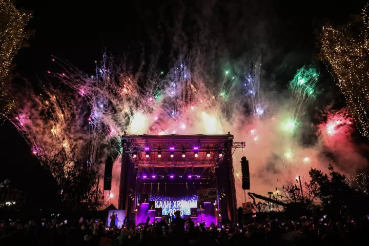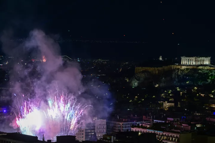 Στις 12 ακριβώς πυροτεχνήματα τινάχθηκαν και φώτισαν τον αττικό ουρανό, αλλά όπως και πέρυσι, έτσι και φέτος ήταν στην πλειοψηφία τους αθόρυβα, ώστε να μην ταραχθούν οι τετράποδοι «κάτοικοι» της πρωτεύουσας. Ταυτόχρονα, στον ουρανό εκατοντάδες drones δημιούργησαν ένα σόου με φωτεινά σχέδια, ενώ στο τέλος σχημάτισαν και το πρόσωπο του Διονύση Σαββόπουλου, καθώς πάνω στη σκηνή τραγούδησαν και δύο δικά του τραγούδια ως έναν μικρό φόρο τιμής.