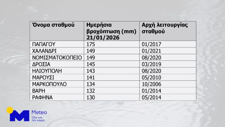 Όπως επισημαίνεται από το ΜΕΤΕΟ/ΕΑΑ οι καταγραφές βροχόπτωσης στις 21/1/2026, αποτελούν τις μεγαλύτερες που έχουν σημειωθεί από την έναρξη λειτουργίας κάθε σταθμού.