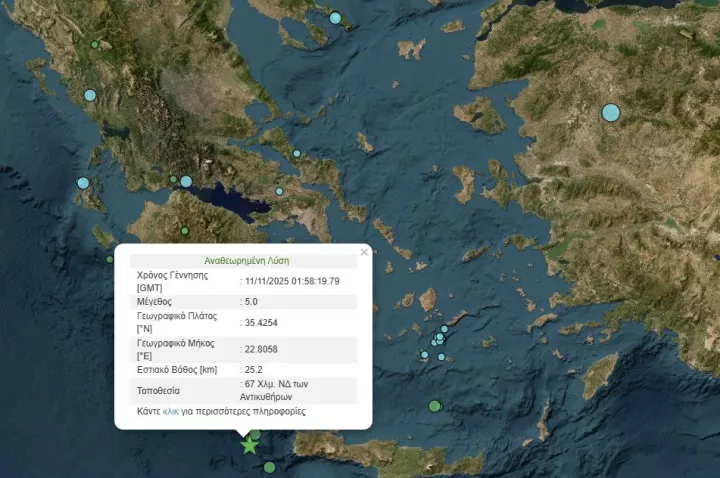 Σύμφωνα με το Γεωδυναμικό Ινστιτούτο του Εθνικού Αστεροσκοπείου Αθηνών, το επίκεντρο της δόνησης εντοπίζεται στον θαλάσσιο χώρο 74 χλμ. νοτιοδυτικά των Αντικυθήρων.
