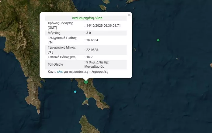 Ασθενής σεισμική δόνηση 3 Ρίχτερ σημειώθηκε το πρωί της Τρίτης στη Μονεμβασιά, μόλις 9 χιλιόμετρα δυτικά νοτιοδυτικά της περιοχής.