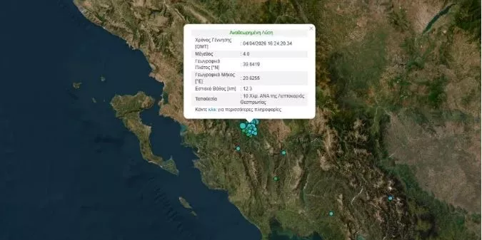 Σεισμός μεγέθους 4 βαθμών της κλίμακας Ρίχτερ σημειώθηκε στη Θεσπρωτία το απόγευμα του Σαββάτου.