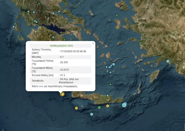 Σεισμική δόνηση μεγέθους 4,1 βαθμών της κλίμακας Ρίχτερ, σύμφωνα με την αναθεωρημένη λύση Γεωδυναμικού Ινστιτούτου του Αστεροσκοπείου Αθηνών, σημειώθηκε νωρίς το πρωί της Παρασκευής (17/10) στις 06:55, σε υποθαλάσσια περιοχή, δυτικά της Κρήτης.