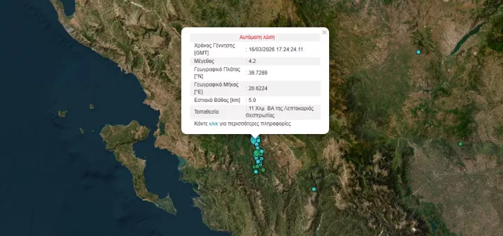 Σεισμός 4,2 βαθμών της κλίμακας Ρίχτερ σημειώθηκε πριν από λίγο στη Θεσπρωτία.