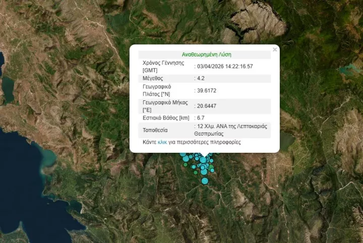Ισχυρή σεισμική δόνηση μεγέθους 4,2 Ρίχτερ σημειώθηκε στην Θεσπρωτία. Σύμφωνα με την αναθεωρημένη λύση του Γεωδυναμικού Ινστιτούτου ο σεισμό σημειώθηκε στις 5:22 το απόγευμα.