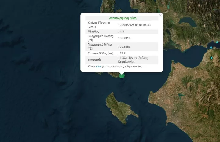 Σεισμική δόνηση της τάξεως του 4,3 της κλίμακας Ρίχτερ σημειώθηκε στις 05:01 το πρωί της Κυριακής στην Κεφαλονιά.