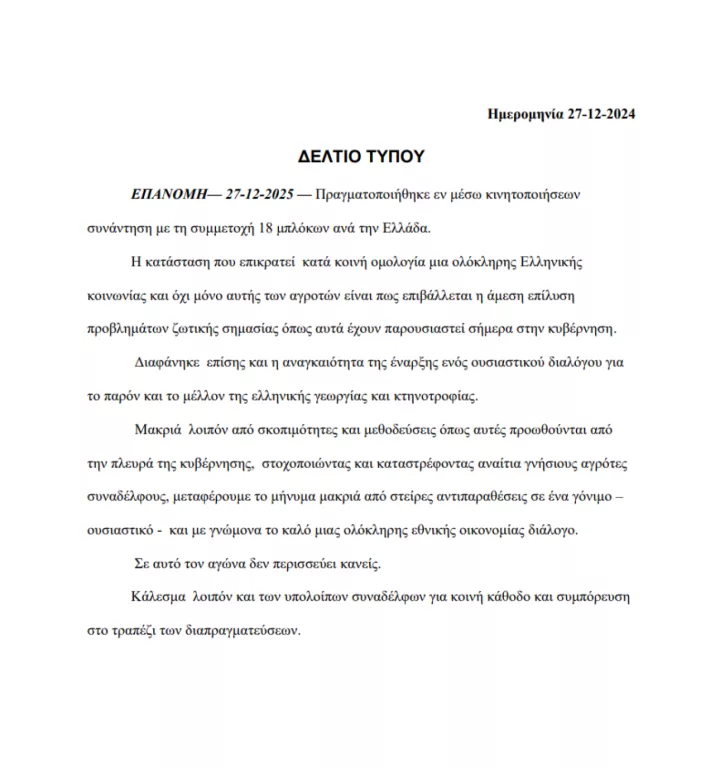 Σε συνθήκες κλιμακούμενων κινητοποιήσεων και αποκλεισμών βασικών οδικών αξόνων και τελωνείων, εκπρόσωποι 18 αγροτικών μπλόκων από όλη τη χώρα πραγματοποίησαν συνάντηση στην Επανομή Θεσσαλονίκης, διαμηνύοντας ότι η κατάσταση που έχει διαμορφωθεί καθιστά επιτακτική την άμεση επίλυση προβλημάτων «ζωτικής σημασίας» και την έναρξη ουσιαστικού διαλόγου με την κυβέρνηση για το παρόν και το μέλλον της ελληνικής γεωργίας και κτηνοτροφίας.