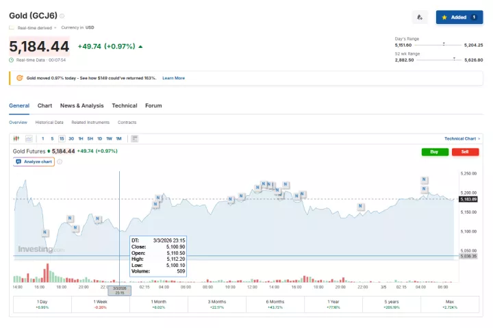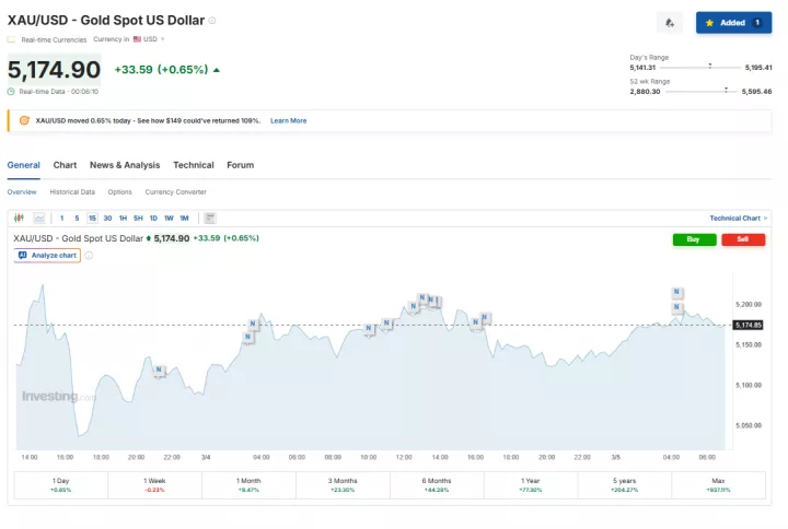 Ειδικότερα, στις 07:06 ώρα Ελλάδας, η τιμή spot του χρυσού κατέγραψε άνοδο 0,65%, διαμορφούμενη στα 5.174,90 δολάρια ανά ουγγιά.