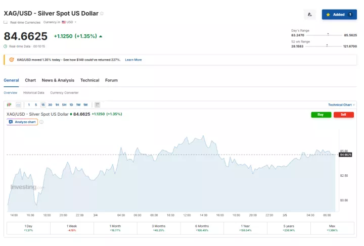 Σε ό,τι αφορά το ασήμι, η τιμή spot του πολύτιμου μετάλλου κατέγραψε άνοδο κατά 1,35% στα 84,66 δολάρια ανά ουγγιά.