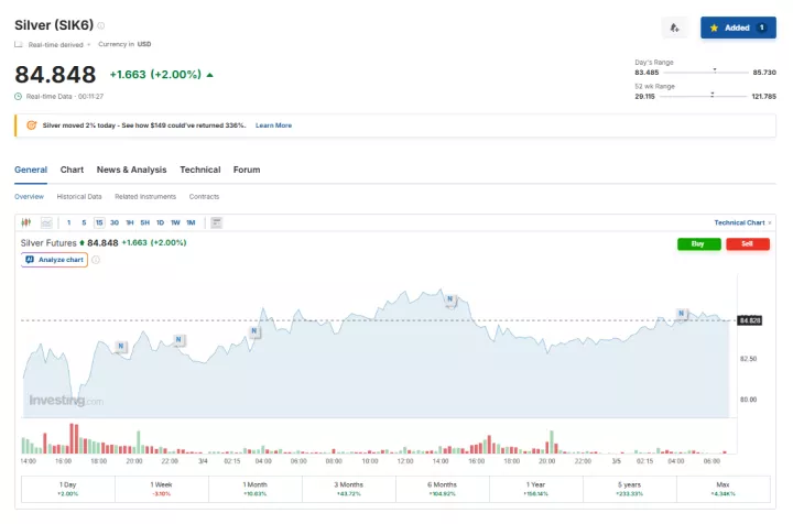 Σε ό,τι αφορά τα futures, οι τιμές στο ασήμι εμφάνισαν άνοδο 2% διαμορφούμενες στα 84,84 δολάρια ανά ουγγιά.