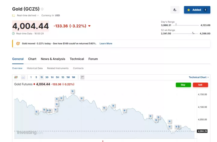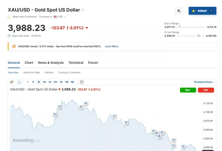 Ειδικότερα, η τιμή spot του χρυσού κατέγραψε πτώση στα 3.988,23 δολάρια ανά ουγγιά λίγο μετά τις 22:00 ώρα Ελλάδας, ενώ ενδοσυνεδριακά έφτασε να καταγράφει πτώση κατά 2,9% στα 3.990,89 δολάρια ανά ουγγιά.
