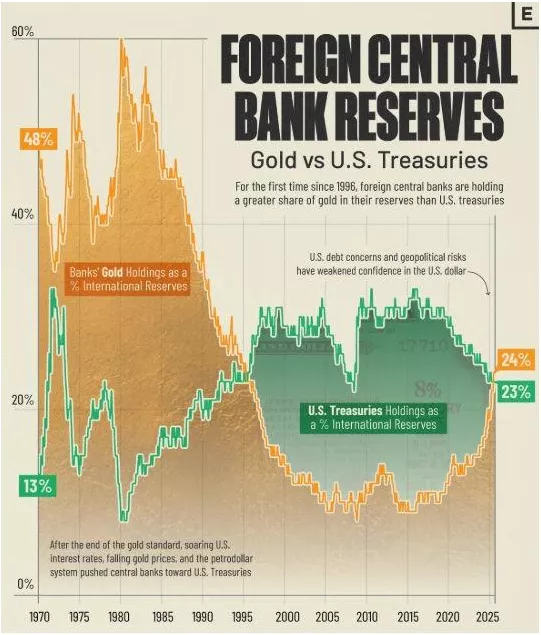 Για πρώτη φορά από το 1996, ο χρυσός καταλαμβάνει μεγαλύτερο μερίδιο στα αποθέματα των κεντρικών τραπεζών από τα αμερικανικά ομόλογα, όπως βλέπουμε και στο ακόλουθο γράφημα από το visualcapitalist. Δηλαδή οι κεντρικές τράπεζες είναι ισχυροί αγοραστές, μεταφέροντας στον χρυσό κεφάλαια που είχαν επενδύσει προηγουμένως σε ομόλογα.