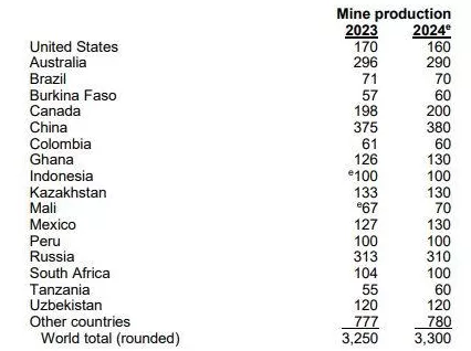Σύμφωνα με το U.S. Geological Survey, Mineral Commodity Summaries, στην έκθεση Ιανουαρίου 2025, όπως βλέπουμε και στον ακόλουθο πίνακα πρώτη στην παραγωγή χρυσού είναι Κίνα με 380 τόνους, ακολουθεί η Ρωσία με 310, η Αυστραλία με 290, ο Καναδάς με 200 και οι ΗΠΑ με 160 τόνους.