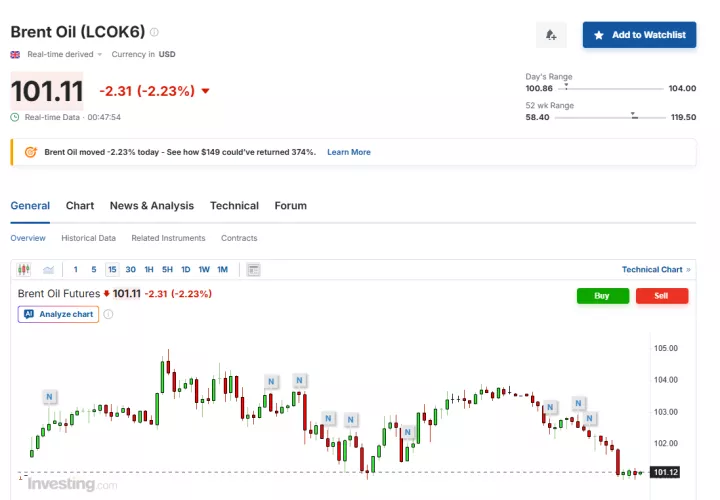 Συγκεκριμένα, το Brent λίγο μετά τις 6:45 ώρα Ελλάδας υποχωρούσε κατά 2,23% στα 101,11 δολάρια το βαρέλι.