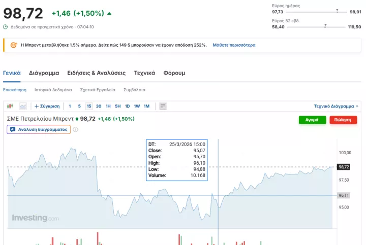 Το διεθνές σημείο αναφοράς, τα συμβόλαια μελλοντικής εκπλήρωσης Brent, αυξήθηκαν κατά 1,47% φτάνοντας τα 98,73 δολάρια ανά βαρέλι, ενώ τα αμερικανικά συμβόλαια West Texas Intermediate ενισχύθηκαν κατά 1,76% στα 92 δολάρια ανά βαρέλι.
