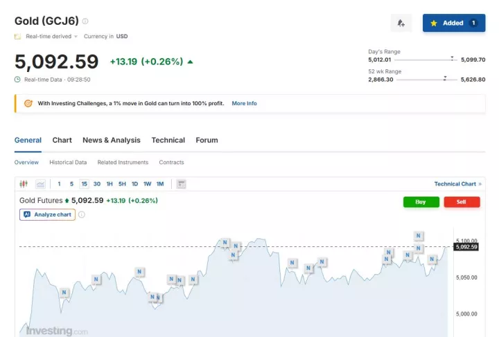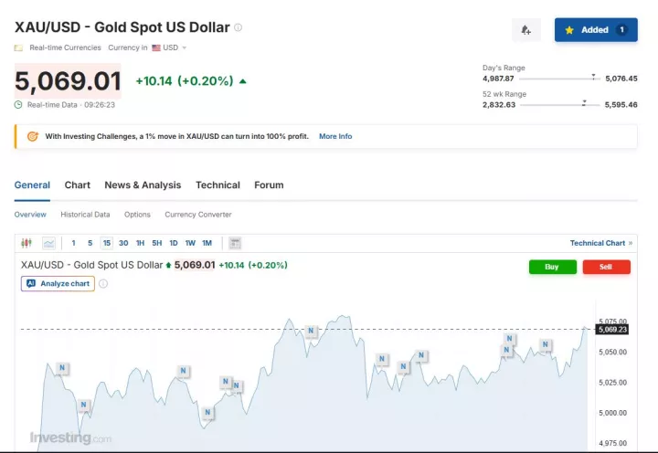 Ειδικότερα, στις 16:30 ώρα Ελλάδας η τιμή spot του χρυσού κατέγραφε μικρή άνοδο κατά 0,20% στα 5.069,01 δολάρια ανά ουγγιά.