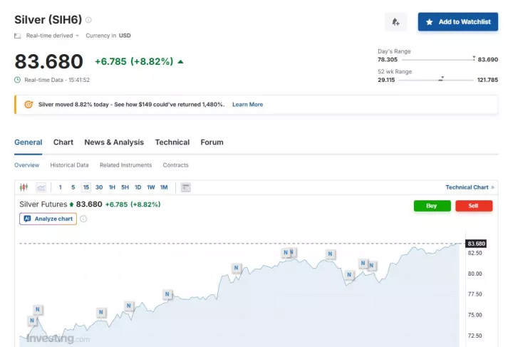 Σε ό,τι αφορά το ασήμι, τα futures του πολύτιμου μετάλλου κατέγραφαν κατακόρυφη άνοδο κατά 8,82%, διαμορφούμενα στα 83,68 δολάρια ανά ουγγιά.