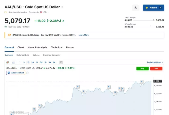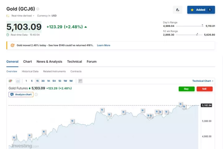Ειδικότερα, λίγο μετά τις 22:45 ώρα Ελλάδας, η τιμή spot του χρυσού κατέγραφε άνοδο 2,38% στα 5.097 δολάρια ανά ουγγιά.