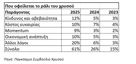 Ο πίνακας που ακολουθεί έχει ιδιαίτερο ενδιαφέρον, καθώς από τους παράγοντες που ευθύνονται για το ράλι θα εξαρτηθεί και η τάση του επόμενου έτους. Σύμφωνα με το Παγκόσμιο Συμβούλιο Χρυσού, το υψηλού κινδύνου γεωπολιτικό περιβάλλον ευθύνεται περίπου για 12 ποσοστιαίες μονάδες ανόδου των τιμών φέτος, ενώ η αποδυνάμωση του δολαρίου «πρόσθεσε» άλλες 10 ποσοστιαίες μονάδες. Άλλες 9 μονάδες οφείλονται στις αυξημένες επενδύσεις (σε κερδοσκοπικούς λόγους δηλαδή) και ακόμη 10 μονάδες στην οικονομική ανάπτυξη.