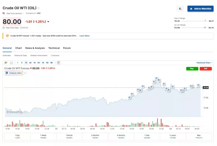 Στις 06:55 ώρα Ελλάδας τα συμβόλαια αργού West Texas Intermediate (WTI) σημείωναν πτώση 1,25%, στα 80 δολάρια ανά βαρέλι.