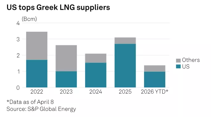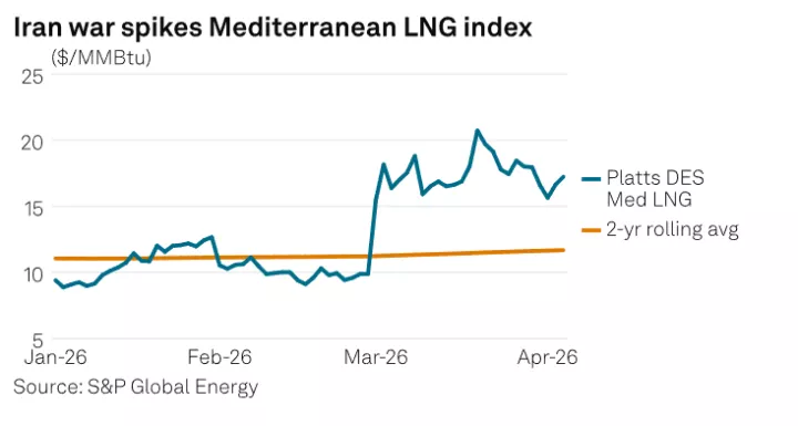 Οι ευρωπαϊκές τιμές LNG έχουν εκτοξευθεί μετά το ξέσπασμα του πολέμου με το Ιράν. Η Platts αποτίμησε στις 7 Απριλίου τον δείκτη DES Mediterranean LNG Marker στα 17,228 δολάρια ανά εκατομμύριο βρετανικές θερμικές μονάδες (MMBtu), αυξημένο κατά 3,6% σε σχέση με τις 2 Απριλίου. Ο δείκτης βρίσκεται κατά 74% υψηλότερα σε σύγκριση με τα τέλη Φεβρουαρίου, όταν ξεκίνησε ο πόλεμος.