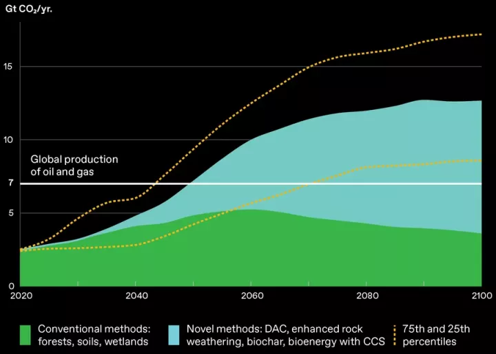Η απόσταση που πρέπει να διανυθεί είναι τεράστια: από το 2019 έως το 2023, μόλις 9 δισ. τόνοι αφαιρέθηκαν συνολικά, σχεδόν όλοι μέσω δασών, με τις καινοτόμες μεθόδους να συμβάλλουν μόλις στο 0,004 δισ. τόνους.